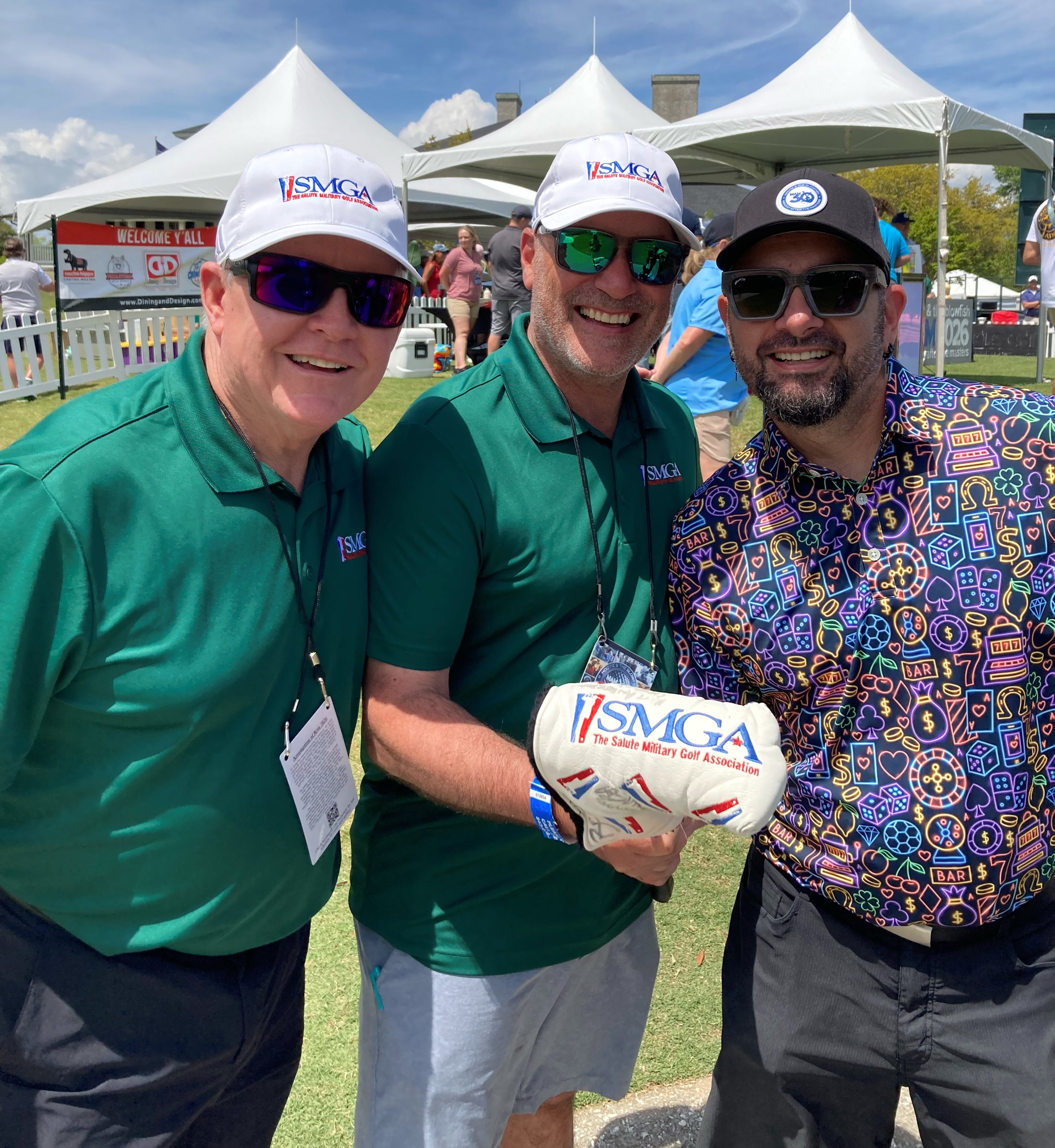 Pictured left to right: Salute Military Golf Association (SMGA) Donor Tom Manix, SMGA Founder Jamie Winslow, and N*SYNC’s Chris Kirkpatrick supporting wounded veterans at ...