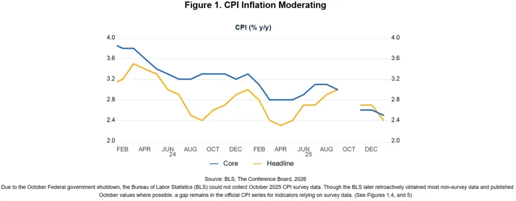 Conference Board Says January CPI Raises More Questions Than It Provides Answers. Moderating inflation in recent months suggests that the Fed may cut rates later this year, even if the FOMC puts cuts on hold in H1. While inflation is expected to rise over the coming months, it should subside in the second half of the year. Despite the improving consumer price index (CPI) picture on the surface, underlying details are less clear. In fact, the Fed’s preferred inflation gauge, the PCE deflator, shows an expected rise in coming months; the December release on February 20th is likely to show core inflation (total excluding food and energy) approaching 3.0% y/y, up from 2.8% in November. The CPI and PCE inflation paths have diverged lately, partly because of uncollected data for the CPI during the federal government shutdown at the end of 2025. While PCE inflation is forecast to peak in H1, the goods CPI inflation has not reached its apex as tariffs continue to flow through the economy and should eventually overwhelm the recent moderation in services prices. While services inflation continues to moderate, it remains sticky, particularly in certain categories related to discretionary spending by higher income households, such as airline fares, insurance, and recreation.