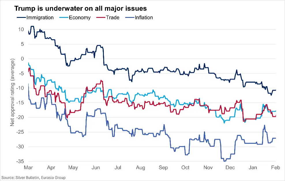 President Trump is Not Digging Himself Out of His Polling Hole. Recent polls would seem to indicate that the Trump administration remains broadly unpopular. In fact, President Trump’s approval rating has fallen below 41%, the lowest of his term so far. Signs of the mid-2025 rebound in voters’ views of the economy and of the country’s direction have disappeared—only 34% of voters have a positive view of the economy, while just 29% believe the country is headed in the right direction, and on specific policy issues, public opinion has turned decisively against the White House. As demographic groups return to their historic baselines, there are growing signs that the coalition of unusual Republican voters that President Trump cobbled together in 2024 is falling apart. Both the negative mood and the shift in issue-specific polling (see chart) are substantial headwinds for an incumbent administration and point to a Democratic-leaning national environment in the midterms, even making the Senate a more plausible flip (35% odds). To dig himself out, at a minimum, the president needs strong job growth and low inflation over the next year. Going forward, ahead of the midterms, congressional Republicans are increasingly likely to seek to differentiate themselves from the administration.