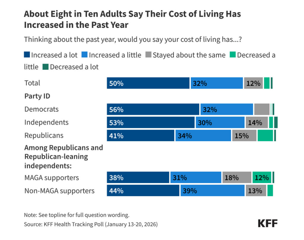 The Big Picture. Even though inflation is ticking down, Americans aren’t feeling it in their wallets. According to a recent survey, 82% feel their cost of living has risen in the last 12 months; this includes 75% of Republicans, 86% of Democrats, and 83% of independents. Thirty-two percent said they are “very worried” about health care costs, the highest of any category of expense.