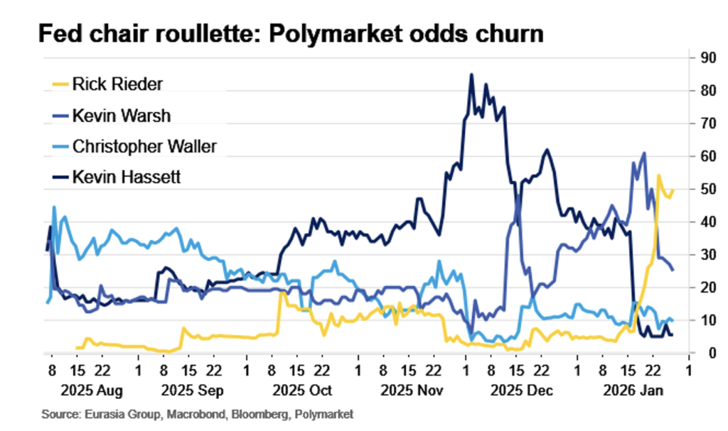 The Fed Will Resist Politicization, Regardless of the Chair. No one should expect an imminent announcement concerning a new Fed chair as there is no immediate deadline to force President Trump to do so. On the shortlist, Rick Rieder is the frontrunner. Of all the candidates, he would make the president look best: a Wall Street success story with credibility with financial markets. His lack of association with the Fed could also make him palatable to Treasury Secretary Bessent, while his lack of association with the Trump administration could be attractive to pivotal Republican votes like Senator Tillis (R-NC). Kevin Hassett is likely underpriced in betting markets at under 10% odds. Although Hassett is not the favorite, he remains the only Trump loyalist on the shortlist. Should the president prefer a loyalist—as he has across the executive branch—Hassett would be the pick. Regardless, the Fed will resist politicization. Events of the first year have demonstrated that the guardrails surrounding Fed independence remain strong. The fact that monetary policy requires a vote of the entire FOMC means that the chair must be a consensus-builder, and political and judicial constraints on the president’s ability to politicize the Fed remain robust.