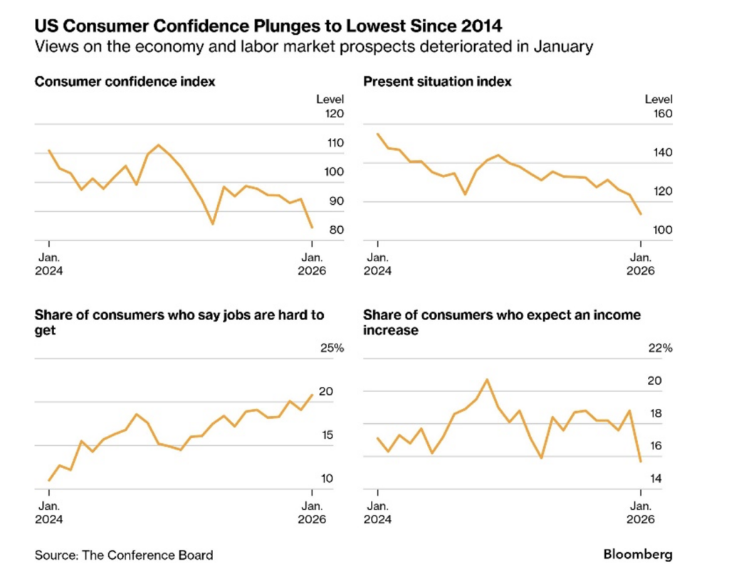 Confidence Tanks. Consumer confidence plummeted in January to its lowest level in 12 years on more pessimistic views from Americans worried about the nation’s economy, inflation, and a weakening labor market. The Conference Board gauge decreased to 84.5, from an upwardly revised 94.2 last month. The figure was the lowest since May 2014, and it fell short of all estimates in a Bloomberg survey of economists.