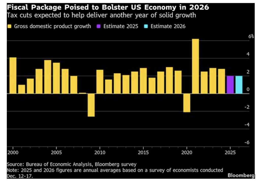 Tax Stimulus to Keep U.S. Economy on Track in 2026. After a year of policy shocks, the U.S. economy is set to get a lift from President Trump’s tax-cuts package in 2026. Americans will get bigger income tax refunds in the first half of this year, incentives for companies to invest in plants and equipment will bolster growth, and lower borrowing costs and steadier trade policy should also help. Still, forecasters see grounds for caution—any burst of consumer spending from fiscal stimulus will fade as the year goes on, tariffs will continue to weigh on businesses, unemployment is on the rise, concerns about affordability remain, the AI boom may not deliver broad-based growth, and the attack on Venezuela shows the potential for geopolitical instability. Adding it up, economists expect growth of 2% in 2026 (the same as the 2025 forecast).
