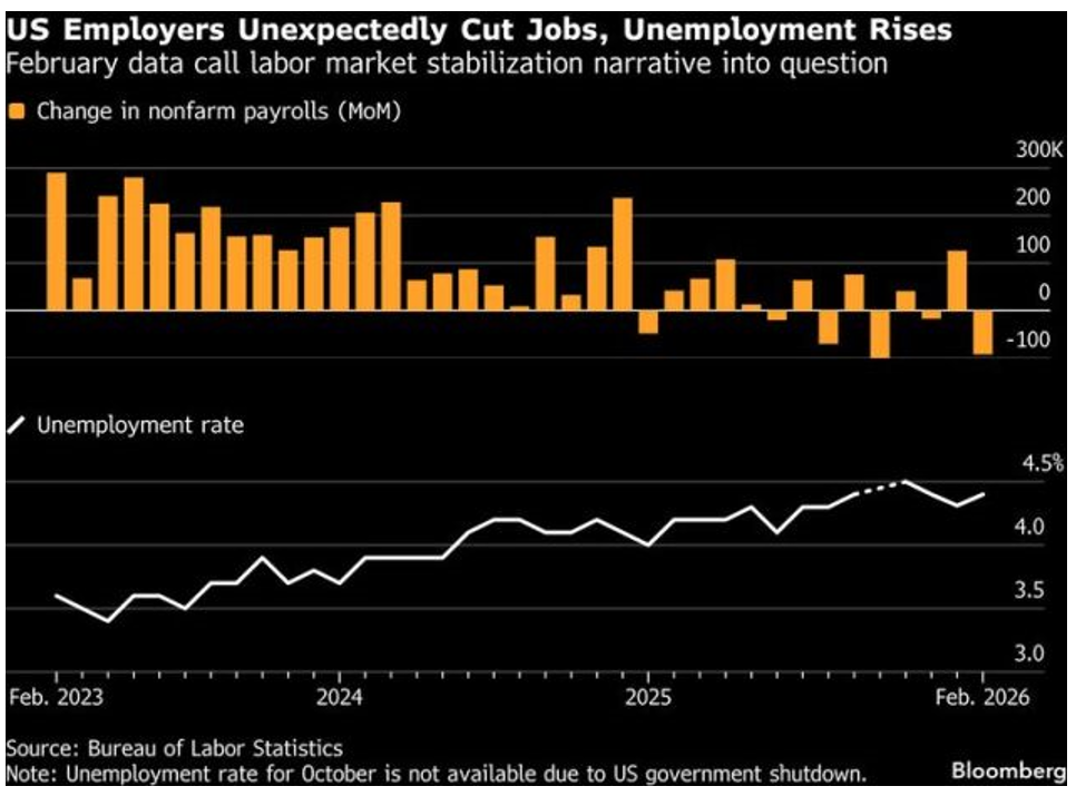 Just when it seemed the labor market was stabilizing, the Bureau of Labor Statistics (BLS) reported that payrolls dropped by 92,000 last month and the unemployment rate grew to 4.4%. The decline in payrolls was one of the largest since the pandemic and reflected decreases in health care employment, leisure, hospitality, and construction. What’s more, manufacturing, transportation and warehousing, and information services also cut jobs. The hiring slump threatens to upend the prevailing view among Fed policymakers that a stabilizing labor market will allow them to keep interest rates steady as they fight persistent inflation. White House National Economic Council Director Hassett said the report was an “outlier,” blaming bad weather and a new BLS process that can produce more volatile.