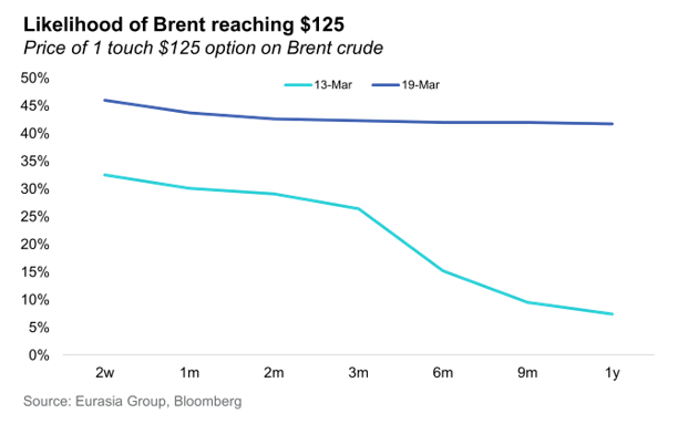 Oil Futures are Priced for a More Prolonged Disruption. Oil options are pricing in longer-lasting risks of high prices. During the early stages of the Iran conflict, oil markets priced in short-term disruption that would quickly fade. The recent change in pricing appears to reflect a significant reassessment of the duration of disruption to energy markets.