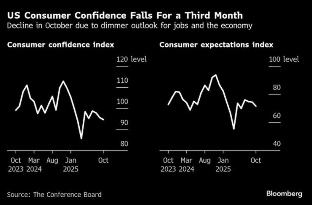Consumers Still Uneasy About the Economy. While President Trump is in Asia, back home the latest data reflects pessimism on home prices, consumer sentiment, and more. In fact, U.S. consumer confidence fell in October for a third straight month on dimmer views about both the economic outlook and labor market. The Conference Board’s gauge decreased 1 point to 94.6, its lowest since April. Expectations for the next six months also fell, while confidence remains stuck below levels seen last year as consumers fret about the labor market and the cost of living.